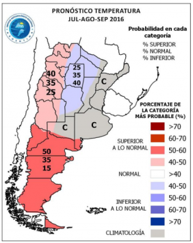 Se prevé mayor probabilidad de ocurrencia de temperatura superior a la normal en la Patagonia, superior a la normal o normal en Cuyo y noroeste de Argentina e inferior a la normal o normal en el norte del país.